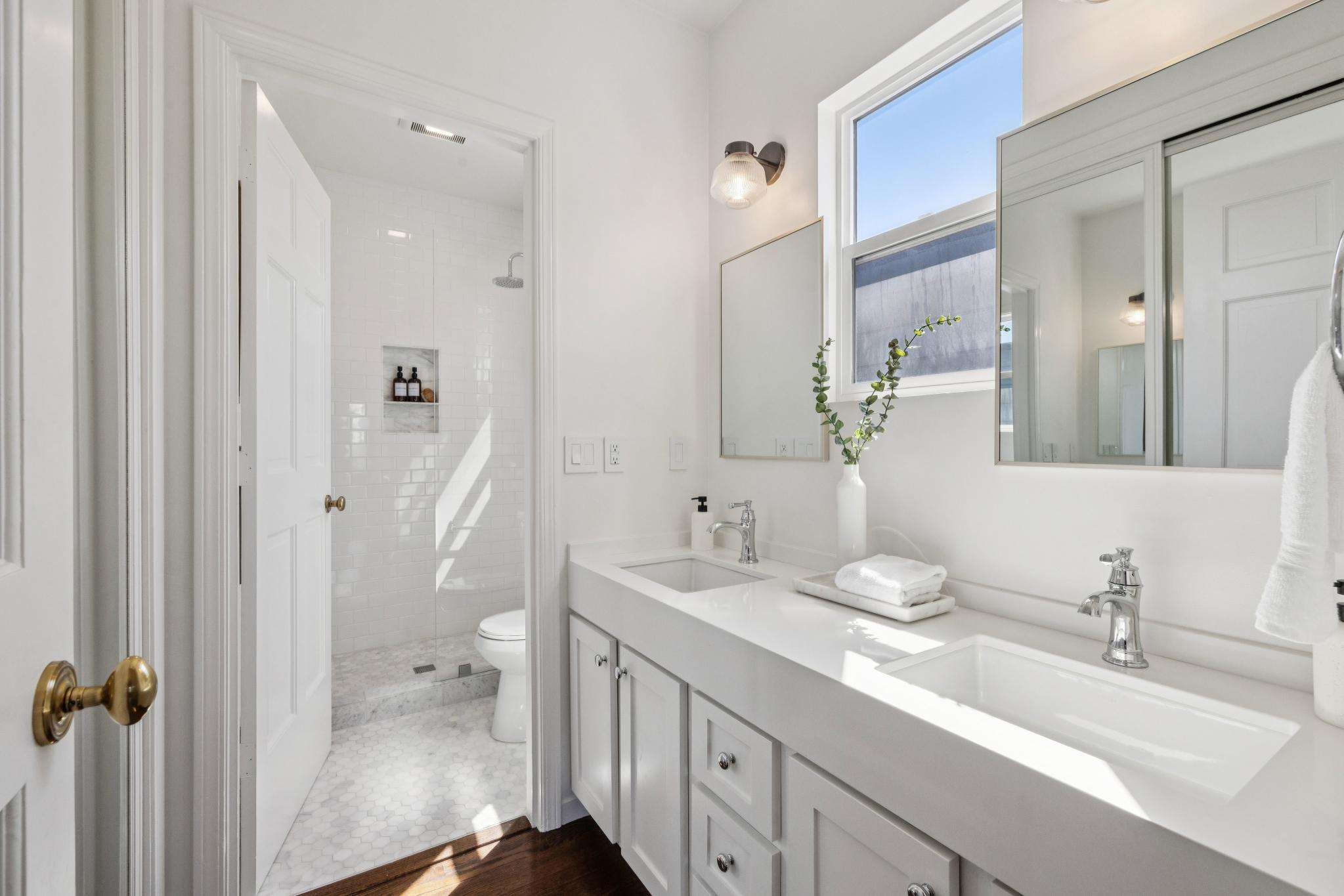 - Primary bath with dual sinks and Carrera marble floor.